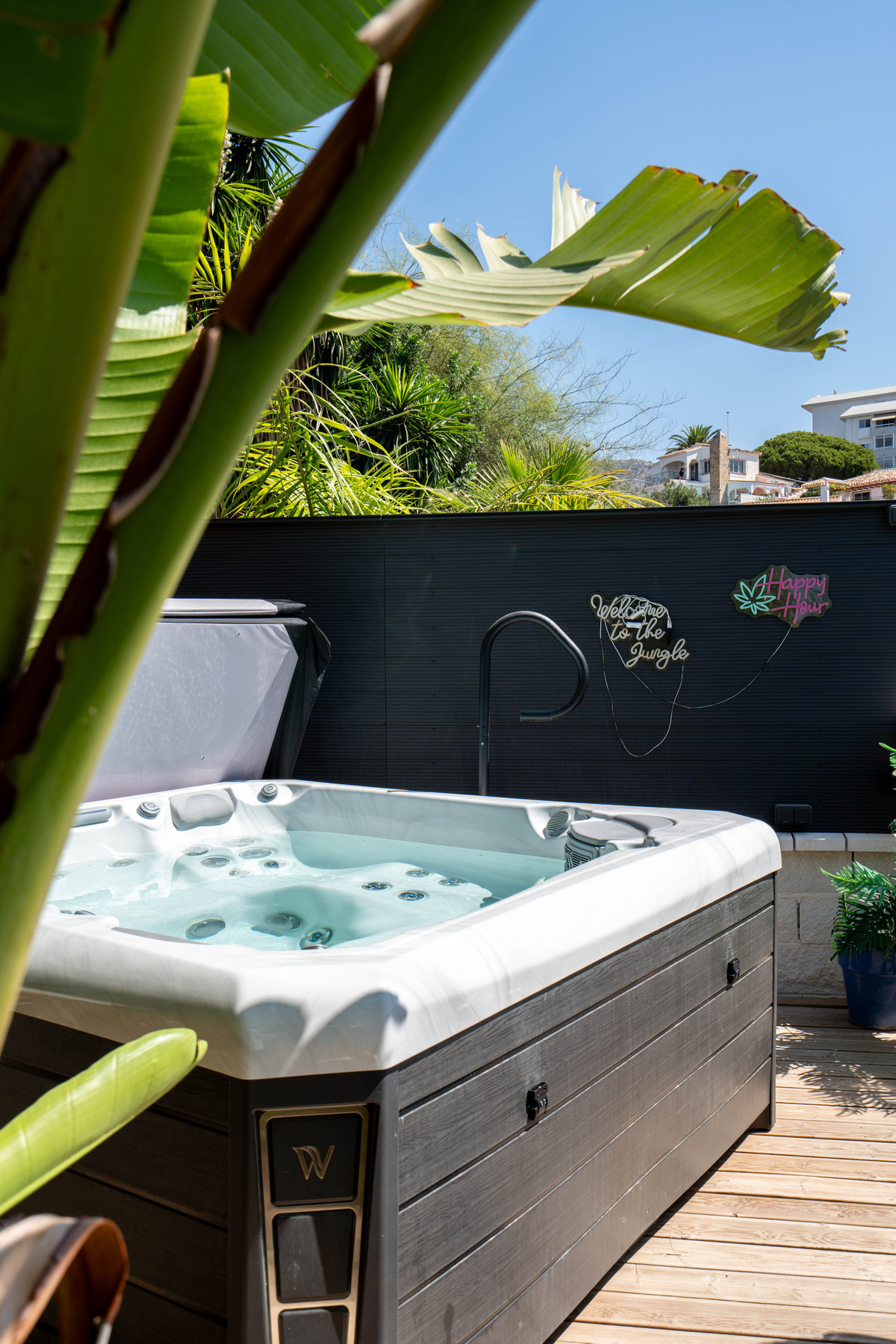 Outdoor entertainment area with jacuzzi and fully equipped kitchen, ideal for relaxing evenings or hosting family and friends