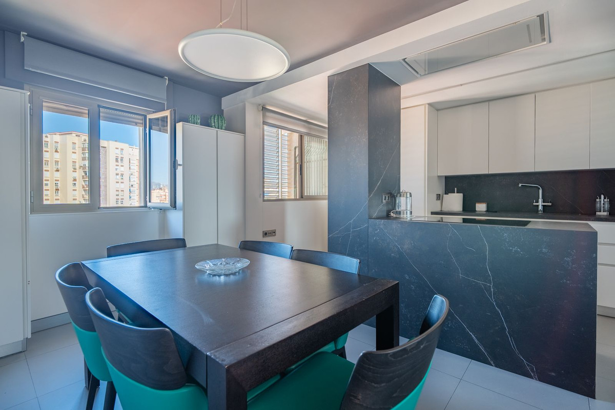 De ruime woon-/eetkamer, gevuld met natuurlijk licht, komt uit op een prachtig terras van 30 m², ideaal om te genieten: of u nu in de zon wilt ontbijten, bij zonsondergang wilt dineren of gewoon wilt ontspannen. Vanaf dit terras heeft u toegang tot een privésolarium van 200 m², een unieke ruimte met een adembenemend panoramisch uitzicht over de stad Malaga, ideaal voor het creëren van een relaxruimte, het aanleggen van een klein zwembad of een stadstuin.