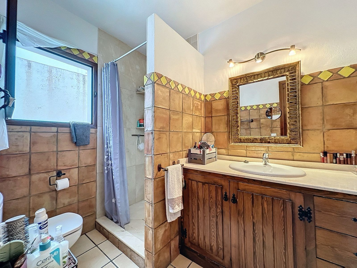 De ruime en lichte hoofdbadkamer is perfect geïntegreerd in de rustieke stijl van het huis, met hoogwaardige afwerkingen die het gevoel van comfort en harmonie versterken.