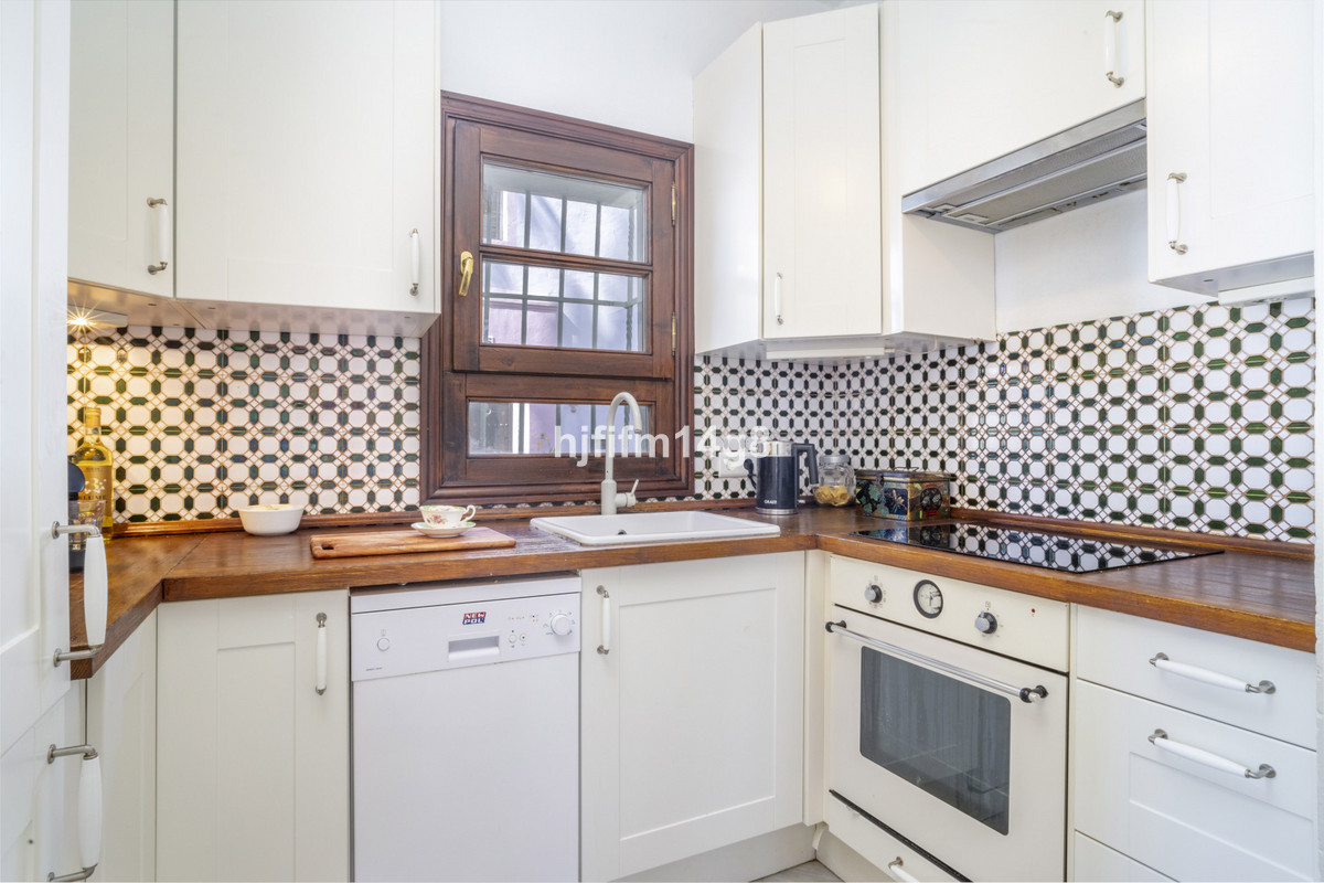 Stap binnen op de middelste verdieping, waar u een charmante woonkamer vindt met twee grote schuifdeuren – één met toegang tot het terras en de andere als Frans balkon. Beide bieden een prachtig uitzicht en baden in het natuurlijke licht. De compacte maar goed ontworpen keuken bevindt zich direct naast de woonkamer – praktisch en efficiënt voor dagelijks gebruik of vakantie.