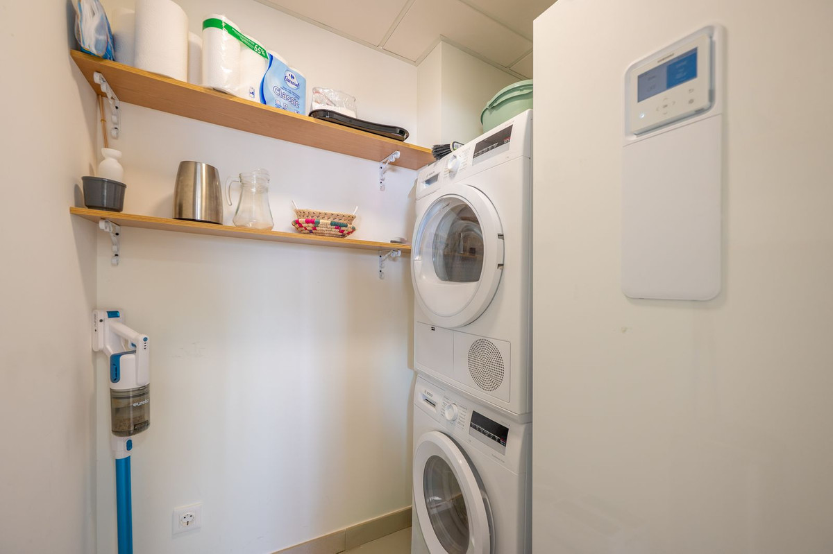 Het appartement beschikt over twee comfortabele slaapkamers. De hoofdslaapkamer van ruim 16 vierkante meter biedt niet alleen ruimte om te ontspannen, maar ook een praktische inloopkast. De tweede slaapkamer van ruim 10 vierkante meter is perfect geschikt als logeerkamer, kantoor of kinderkamer. Beide badkamers zijn zorgvuldig ontworpen en afgewerkt met hoogwaardige materialen. Een extra troef is de aparte wasruimte, die de woonruimtes overzichtelijk houdt.