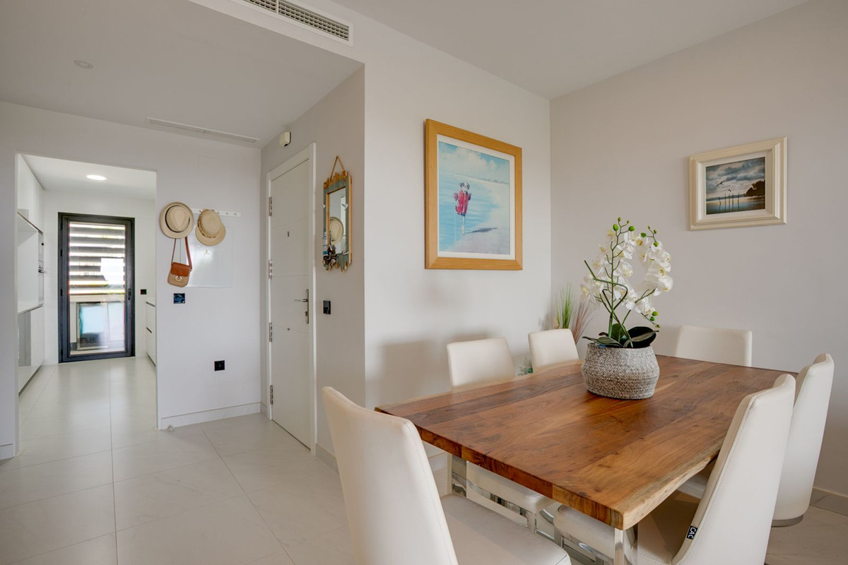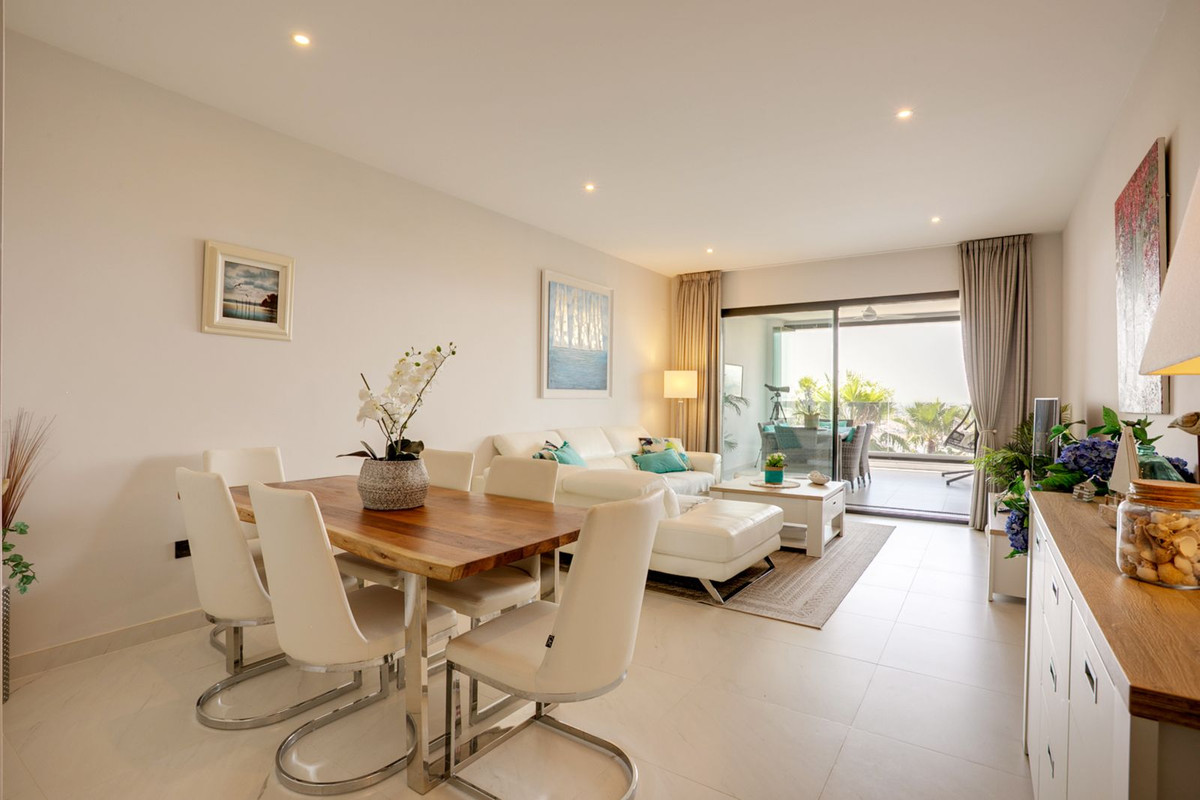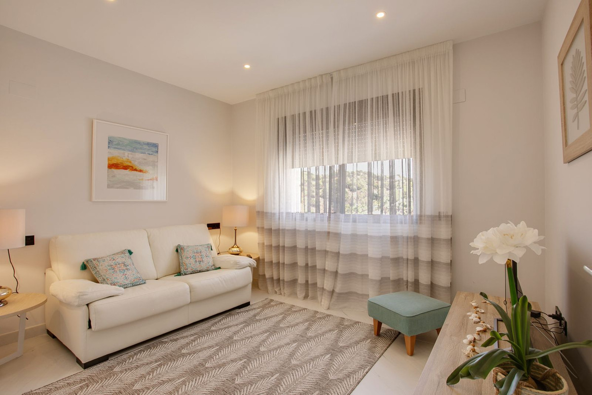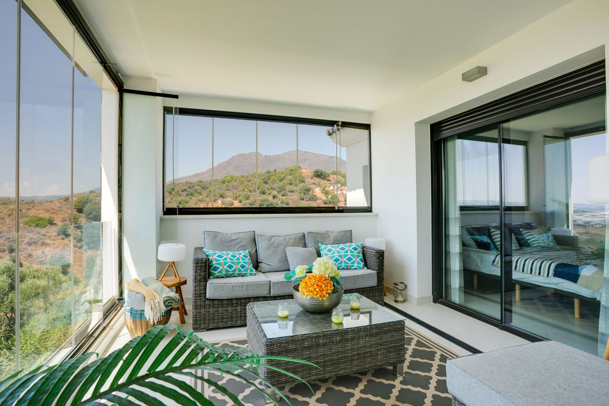 Bij binnenkomst wordt u verwelkomd in een prachtig ontworpen woonkamer met een halfopen, volledig ingerichte keuken. De ruimte loopt naadloos over in een groot overdekt terras, omgeven door glasgordijnen, zodat u het hele jaar door van het buitenleven kunt genieten. Vanaf hier kunt u genieten van een panoramisch uitzicht op de Middellandse Zee, de weelderige gemeenschappelijke tuinen, de zwembaden en de majestueuze bergen van Estepona. Deze prachtige woning is een hoekwoning en wordt niet over het hoofd gezien door andere eigenaren, in een blok van slechts 5 appartementen.