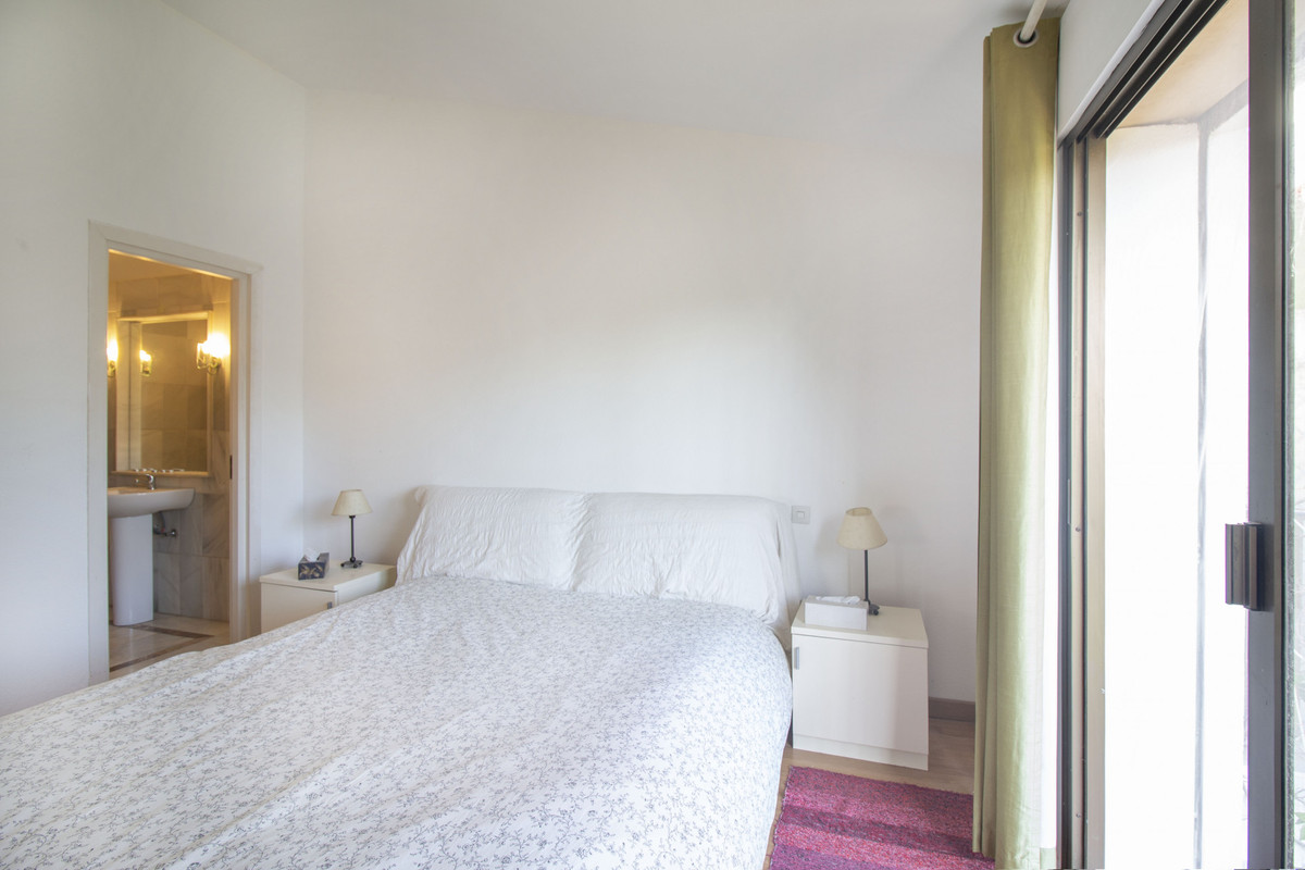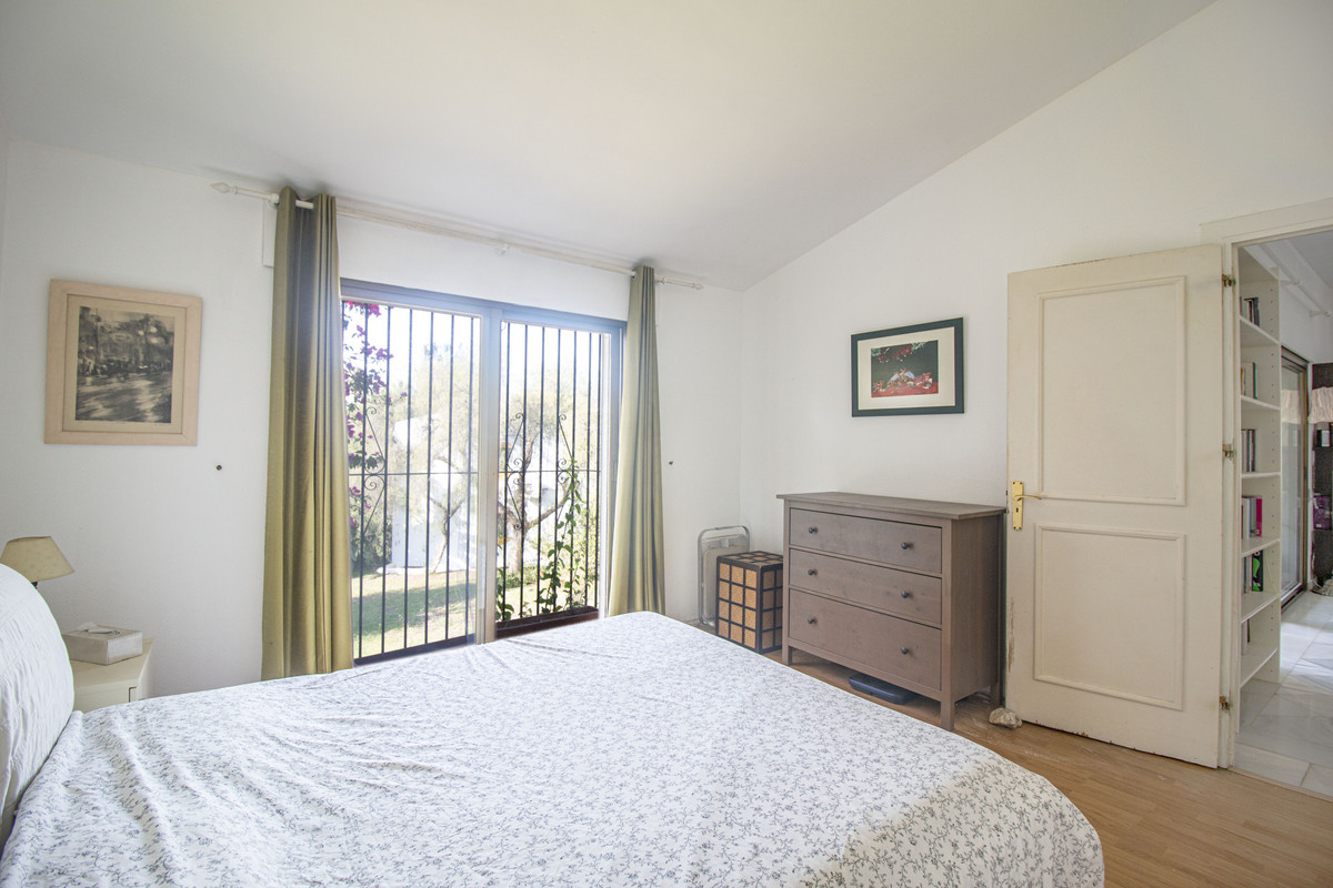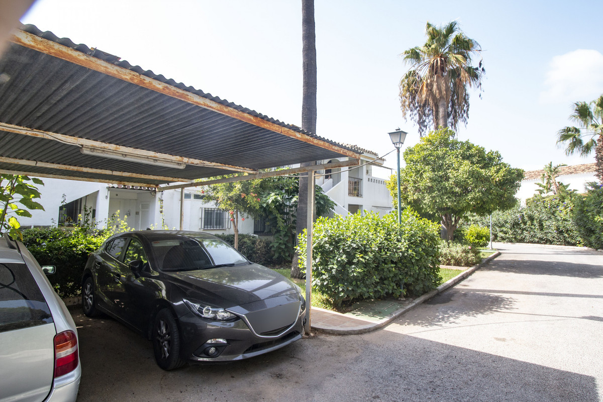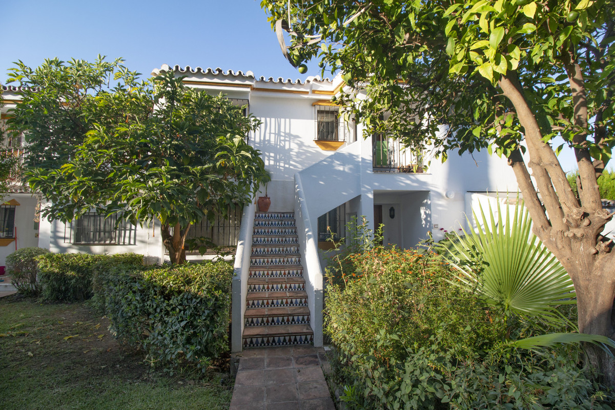 Vanuit de woonkamer leiden schuifdeuren naar een overdekt terras met glazen gordijnen, een veelzijdige buitenruimte die ideaal is om te ontspannen of gasten te ontvangen in alle seizoenen. Het terras biedt uitzicht op de perfect onderhouden gemeenschappelijke tuinen, omgeven door volgroeid groen en een groot zwembad dat u uitnodigt om te genieten van de levensstijl aan de Costa del Sol.