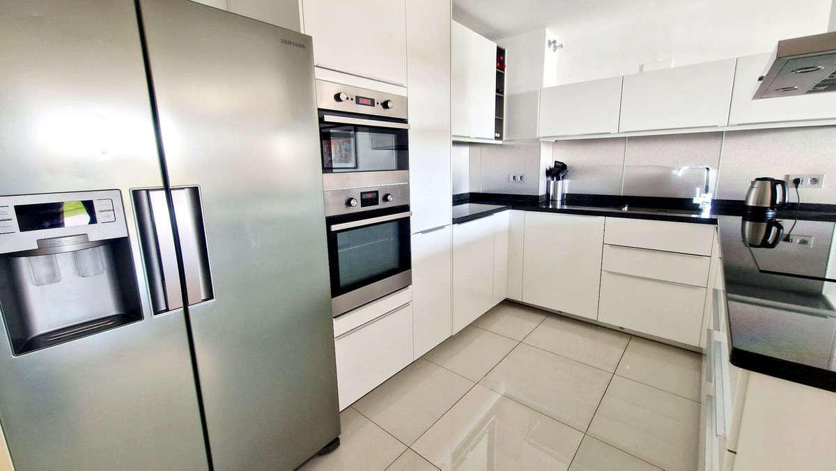De ruime woonkamer komt uit op een groot terras van 55 m², omgeven door glas, waar u het hele jaar door kunt genieten van het uitzicht op zee. De woning beschikt tevens over twee ondergrondse parkeerplaatsen en twee bergingen.