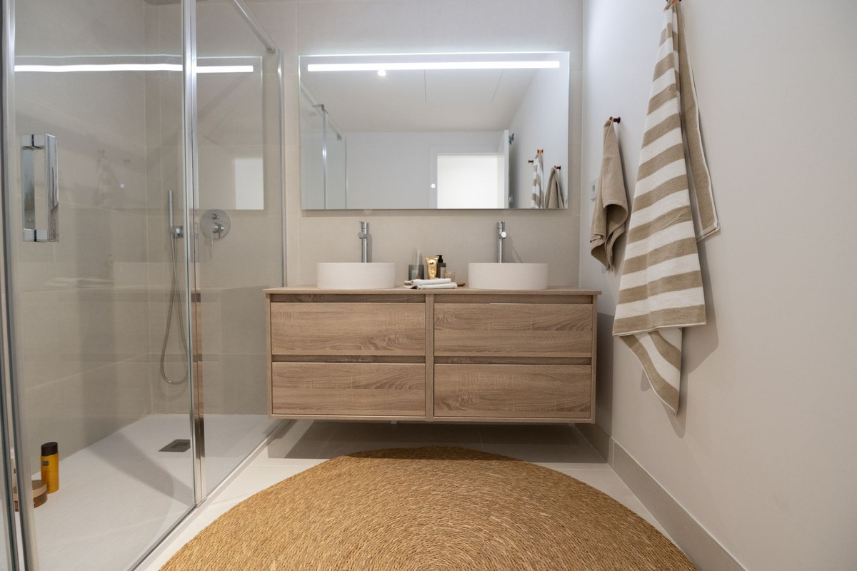 Het appartement bestaat uit 2 slaapkamers, 2 badkamers (waarvan de hoofdslaapkamer en suite), een ruime woon-/eetkamer met een hoogwaardige geïntegreerde keuken en een groot terras op de begane grond. Op de bovenverdieping bevindt zich een ruim solarium met veel potentieel.