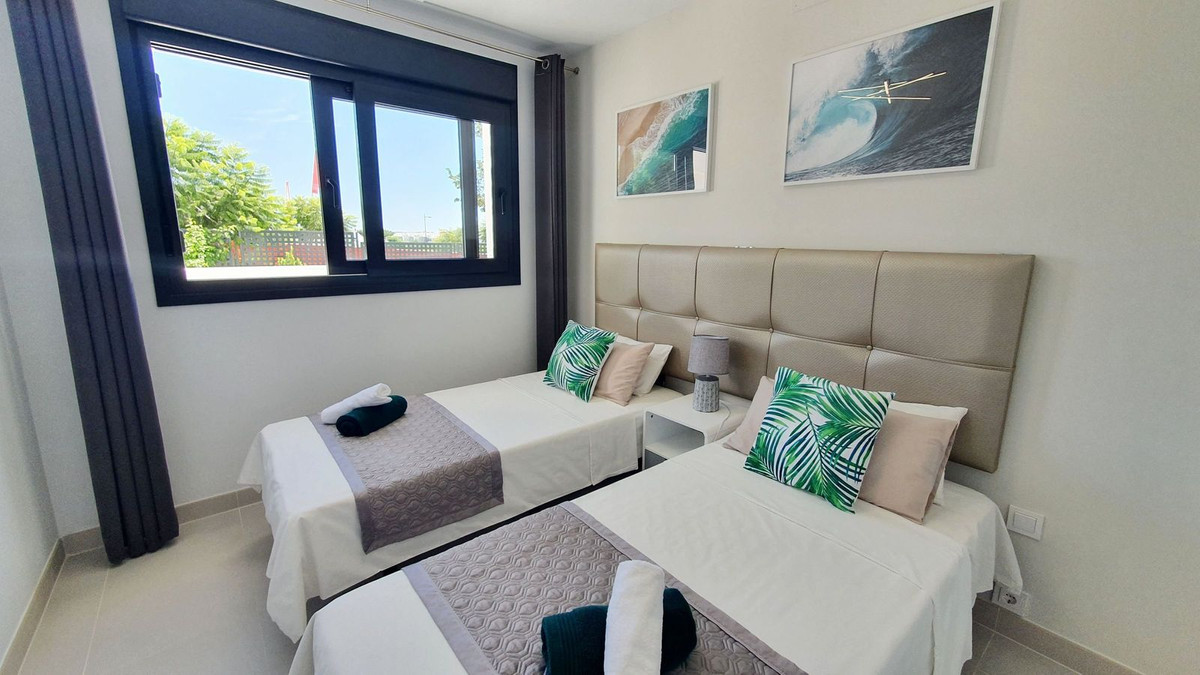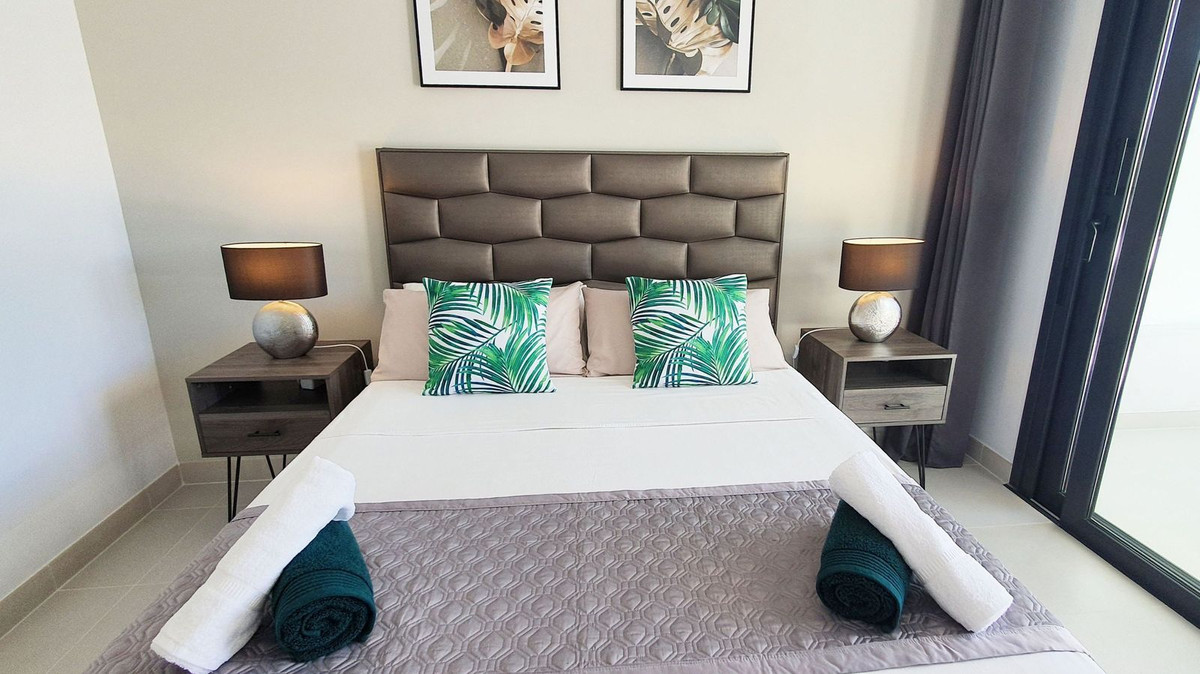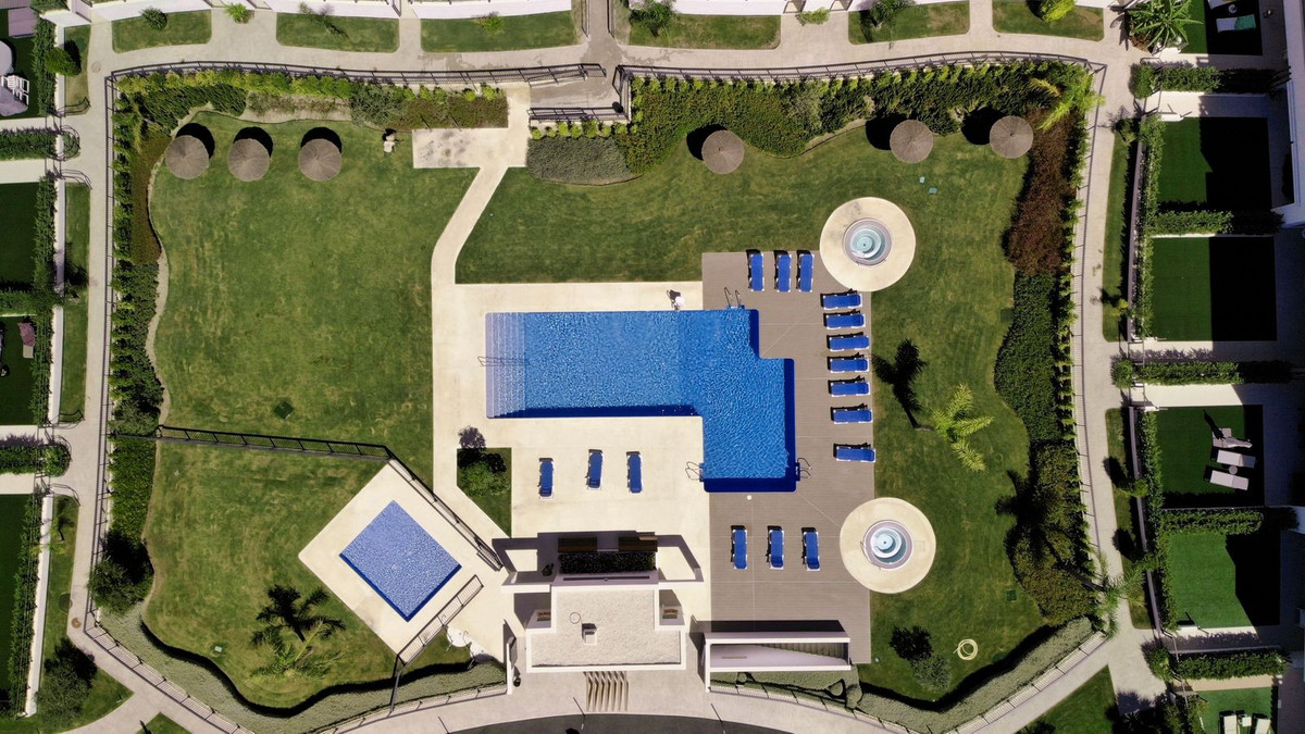 De lichte, open woon- en eetkamer loopt natuurlijk over in het terras op het westen en de privétuin, waardoor er een naadloze verbinding ontstaat tussen binnencomfort en buitenrecreatie. Ramen van vloer tot plafond vullen de ruimte met natuurlijk licht en bieden een prachtig uitzicht op de gemeenschappelijke tuinen en zwembaden. Premium specificaties omvatten vloerverwarming door het hele huis, centrale airconditioning, een geavanceerd warmtepompsysteem, supersnel glasvezelinternet en smaakvolle meubels die moderne verfijning uitstralen.