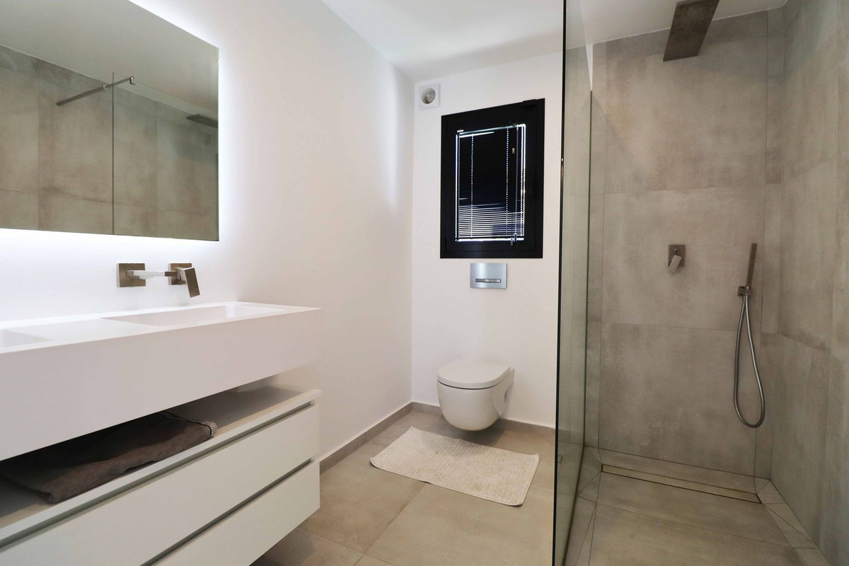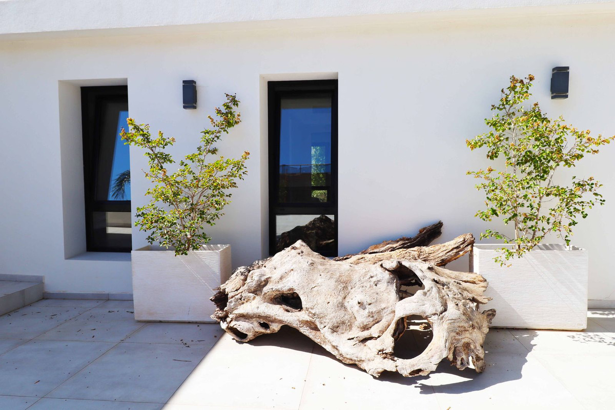 Het eigentijdse ontwerp versterkt het interieur door ramen die van de vloer tot het plafond reiken. Hierdoor is er veel natuurlijk lichtinval en heeft u een prachtig uitzicht op zee.