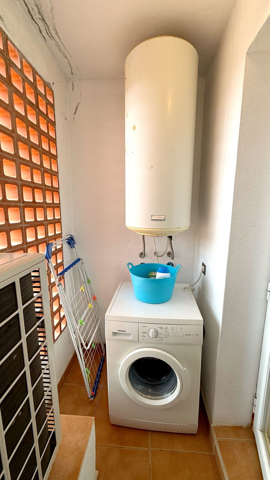 The bright semi-open kitchen, connected to the living room, includes a convenient laundry area equipped with a washing machine and dryer.